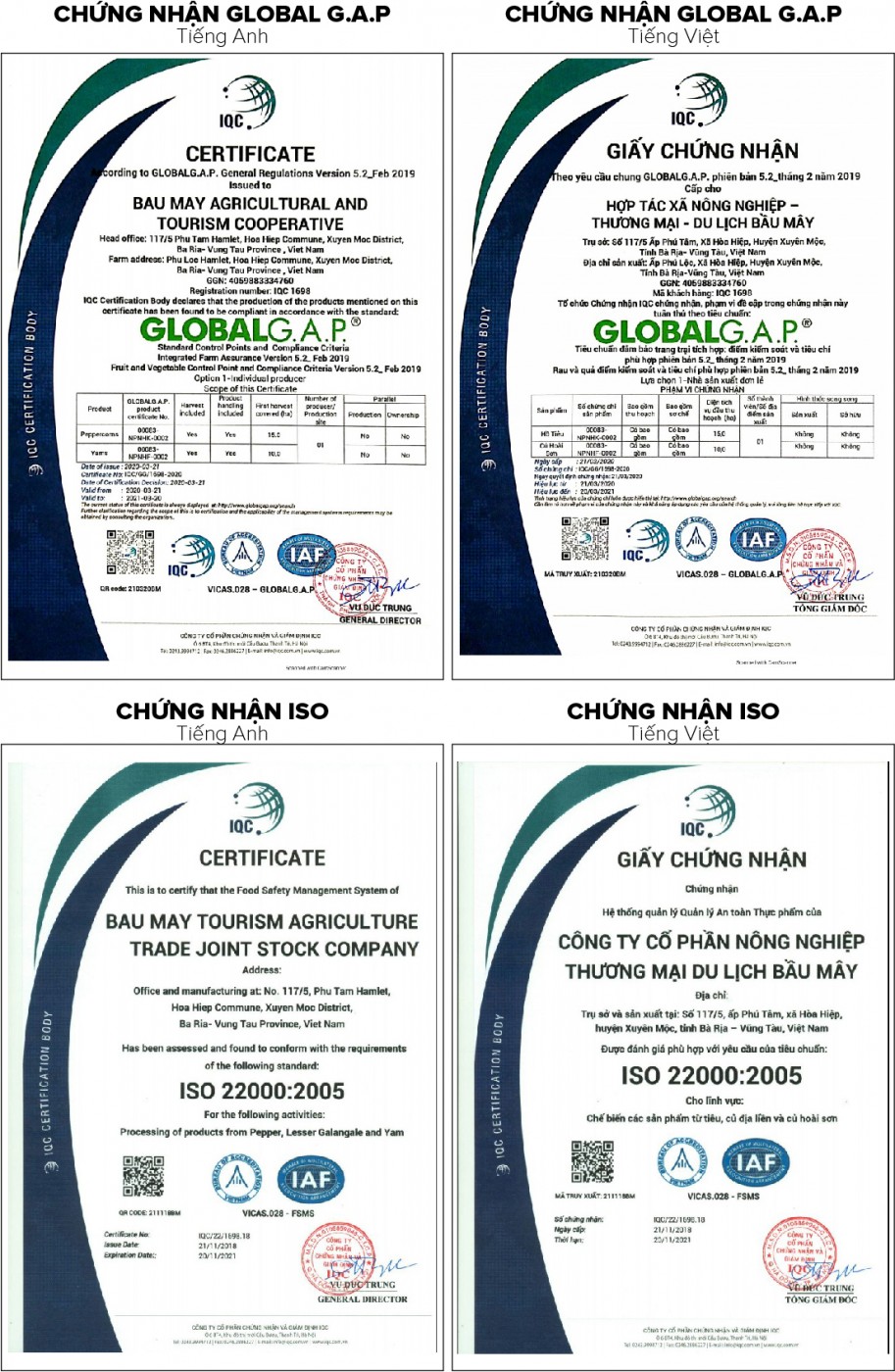 Củ Hoài Sơn Bầu Mây được chứng nhận đạt chuẩn hữu cơ đầu tiên và duy nhất tại Việt Nam, do ông Lâm Ngọc Nhâm nhà khoa học của nhà nông nghiên cứu trực tiếp qua hơn 16 năm trồng theo phương pháp hữu cơ gia truyền và theo tiêu chuẩn ISO 22000:2018.